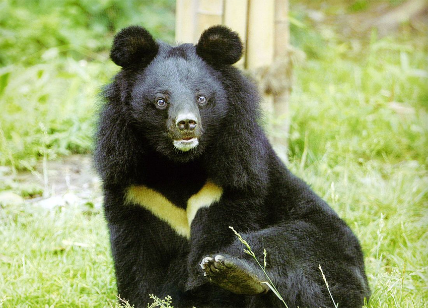 黑熊(别名亚洲黑熊、月熊、月牙熊、狗熊、黑瞎子),食肉目、熊科动物,列入《国家重点保护野生动物名录》二级。体毛黑亮而长,下颏白色,胸部有一块“V”字形白斑。头圆,耳大,眼小,吻短而尖,鼻端裸露,足垫厚实,前后足具5趾,爪尖锐不能伸缩,身体粗壮。